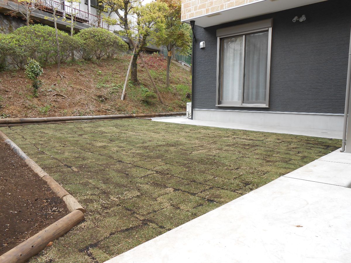 ED様邸の中庭の芝張替え作業完成です。